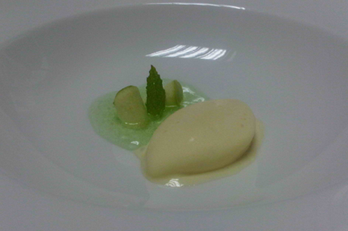 fois gras royal με καραβίδα και πετιμέζι, πουρές από ξινόμηλα με μακεδονικό χαλβά και κανέλα