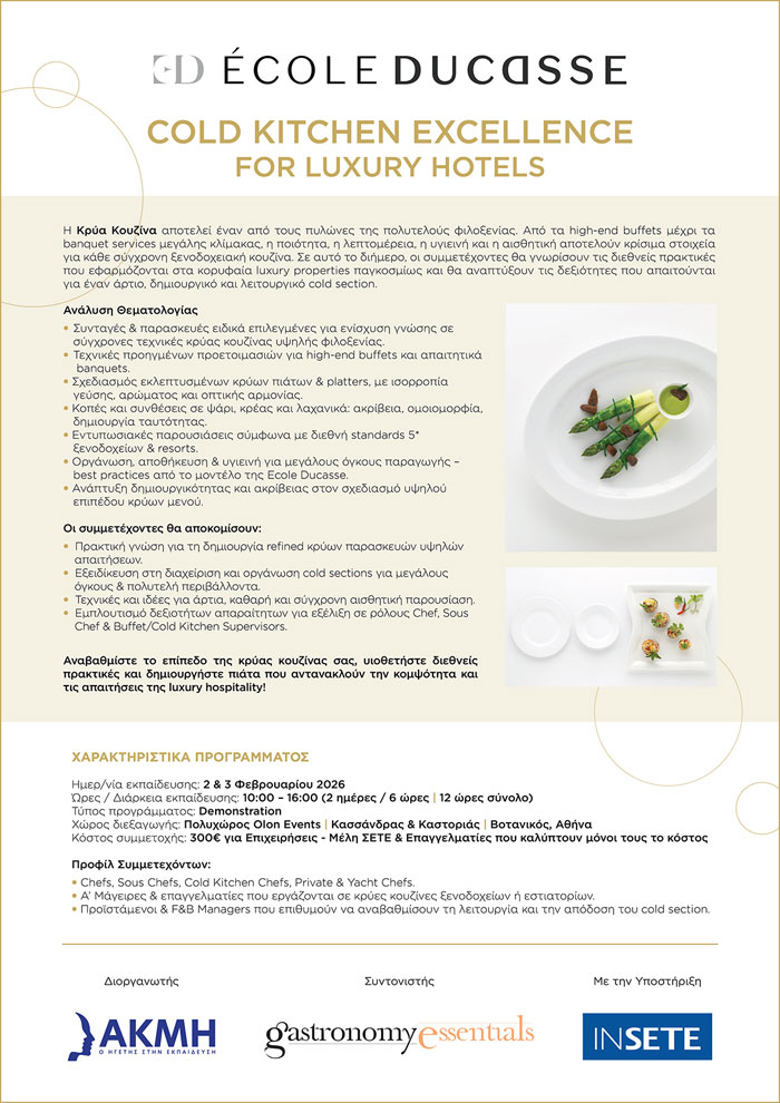 Αναβαθμίστε το επίπεδο της κρύας κουζίνας σας, υιοθετήστε διεθνείς πρακτικές και δημιουργήστε πιάτα που αντανακλούν την κομψότητα και τις απαιτήσεις της luxury hospitality.